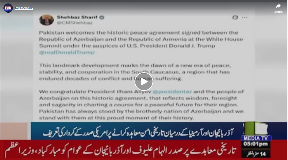 وزیراعظم کی آذربائیجان اور آرمینیا کے درمیان تاریخی امن معاہدہ کرانے پر امریکی صدر کے کردار کی تعریف