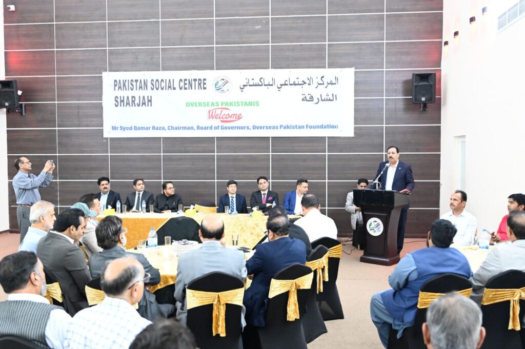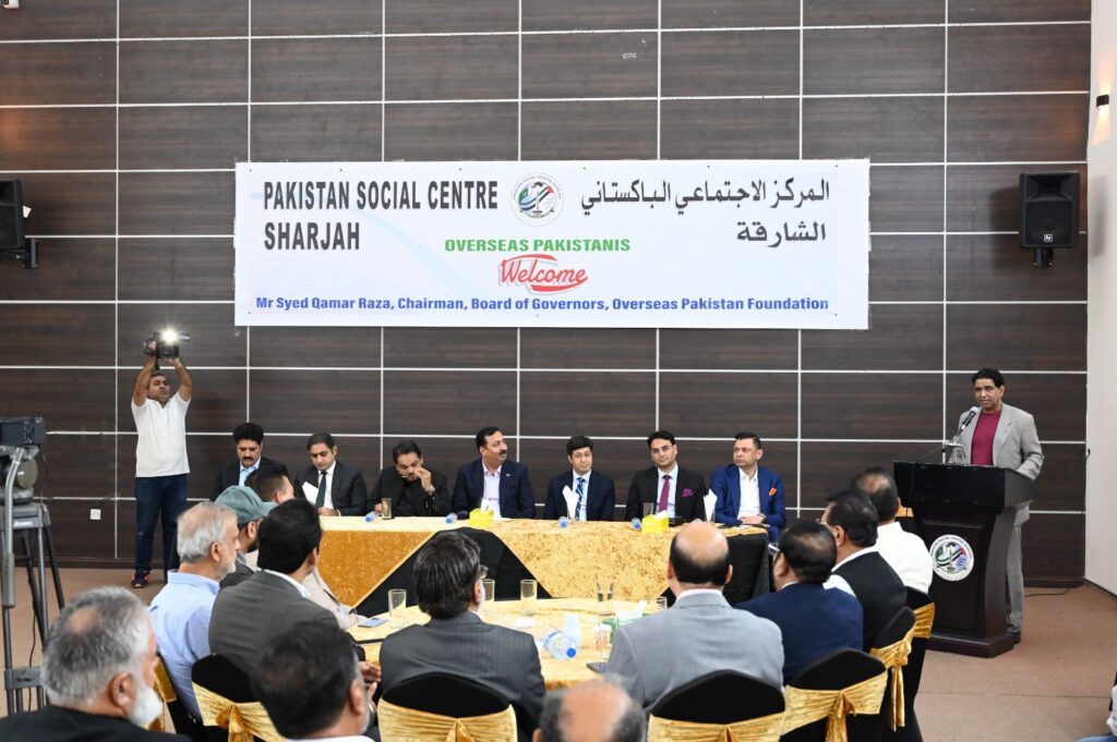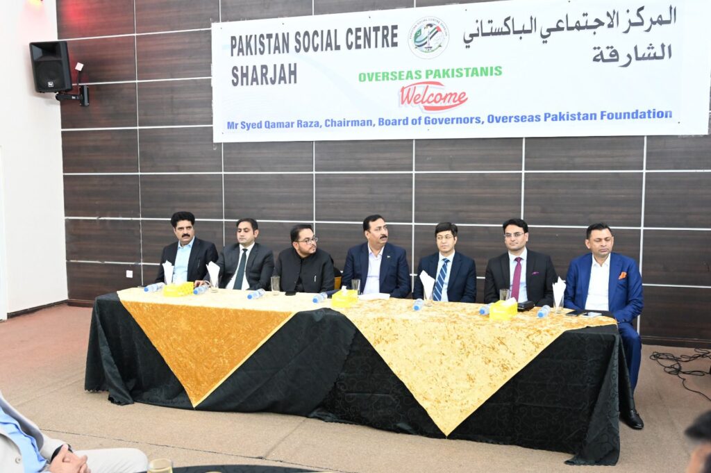 Chairman Overseas Pakistanis Foundation (OPF), Syed Qamar Raza, attended an interactive session with the Pakistani community at the Pakistan Social Centre Sharjah. The event hosted by Mr. Khalid Hussain Chaudhry, President of the Centre, was attended by H.E. Hussain Muhammad, Consul General of Pakistan in Dubai, Community Welfare Attachés Mr. Imran Shahid, and Mr. Junaid Murtaza, as well as many community members, including office bearers of various Pakistani business councils.